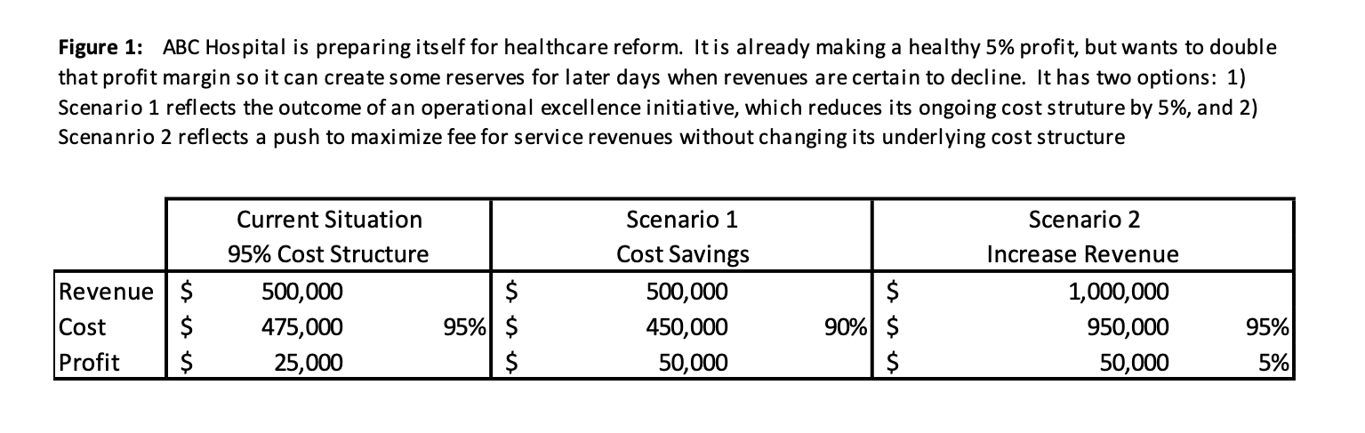 “So if we’re trying to double our profit margin,” Walsh explains, referring to Figure 1, “all you need to do is drop your cost structure [Scenario One] by five points. That gets you an additional $25 million to the bottom line. But if you stay at 95% cost structure and 5% margin, and don’t change cost structure at all, you’ll need a half billion dollars to make that same impact. How many MRIs would you need annually to reach a half billion? It’s going to be a very high number.”